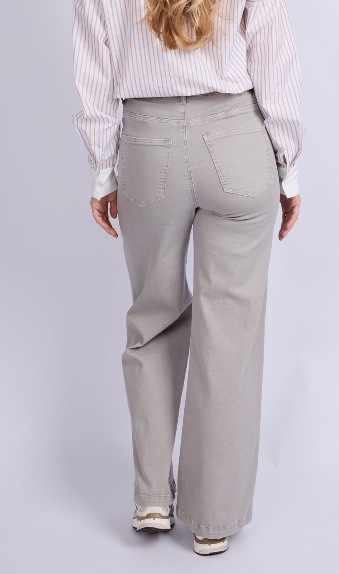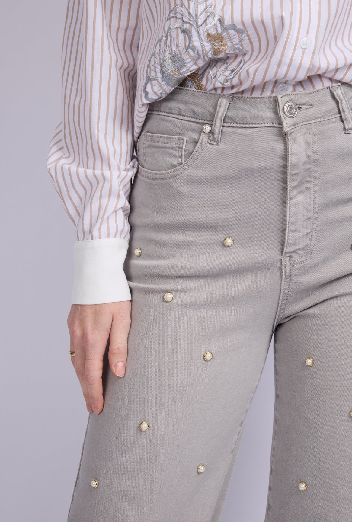 De Parisa broek in denim stof grijs heeft een relaxed fit, hoge taille en rechte pijp , de parels geven de broek een voorjaars uitstraling , eenvoudig te combineren,