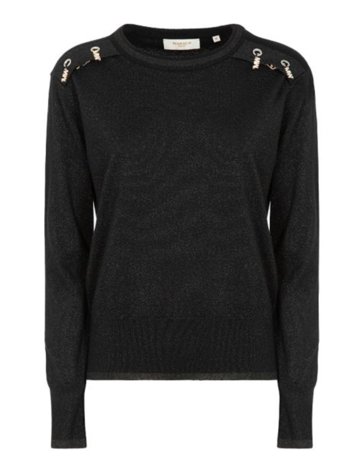 Zwart glanzende trui, fijn brei, met goud strass details langs de schouder lijn,