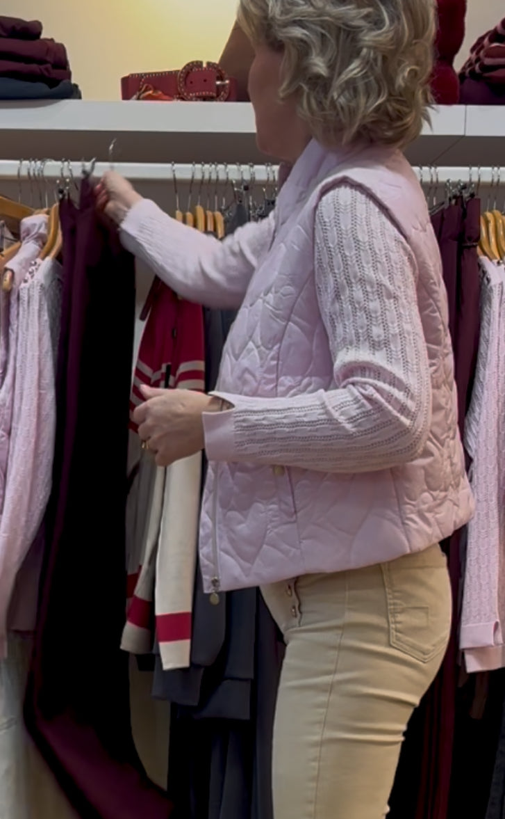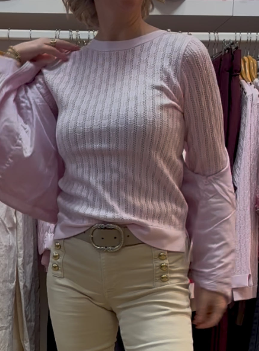 Fin gebreid truitje met ingebreid patroon, boothals met gouden knoopjes , zacht rosé