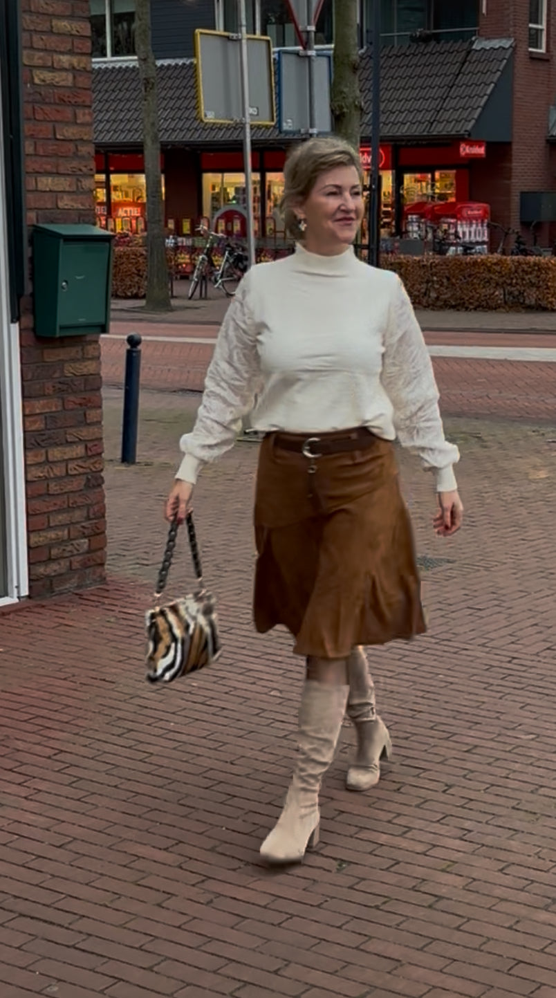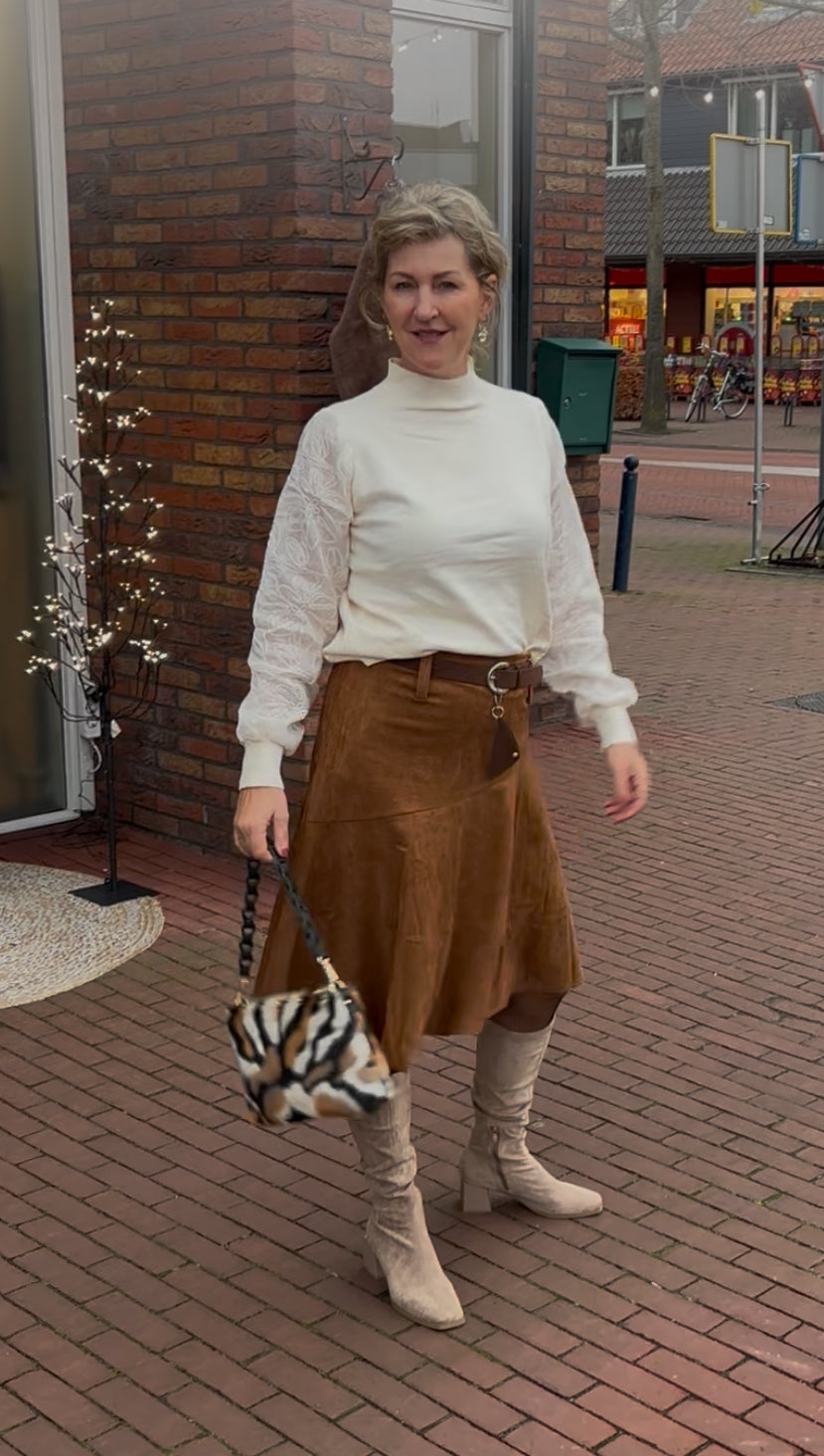 A symetrisch is deze store rok in Soepeke suedine , incl riem,