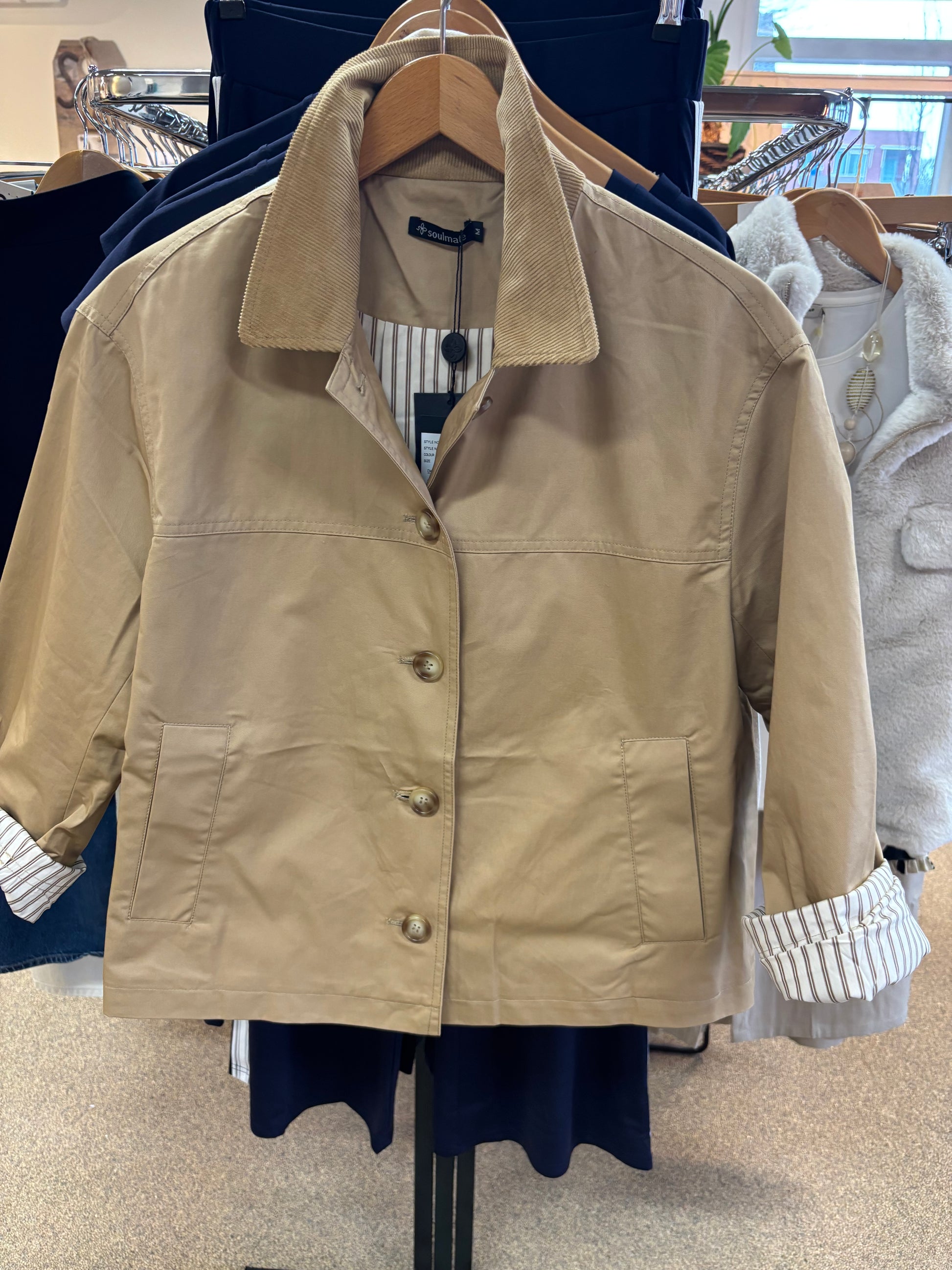Kort jack in zand met stoere rib kraag en streep voering