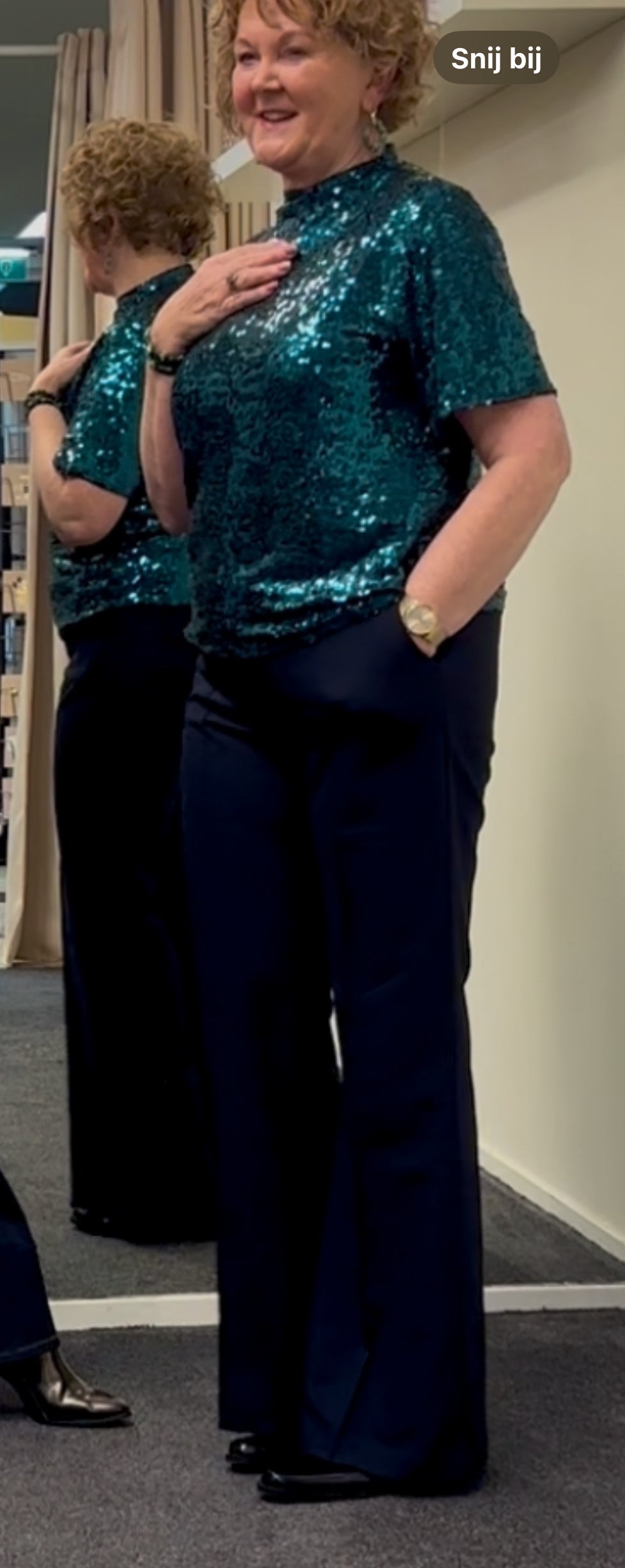 In dikkere kwaliteit travel broek ( stof met textuur) met naad op been en iets uitlopende pijp, steekzakken , zit top!